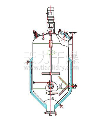 本設(shè)備是由附夾套的橢圓封頭,錐形底的圓筒體,內(nèi)裝三葉式攪拌以及特殊的微調(diào)旋出液管等組裝而成。