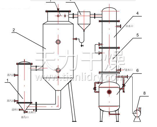 1.加熱器 2.蒸發(fā)器 3.氣液分離器 4.冷凝器 5.冷卻器 6.受液體罐 7.除沫器 8.真空泵